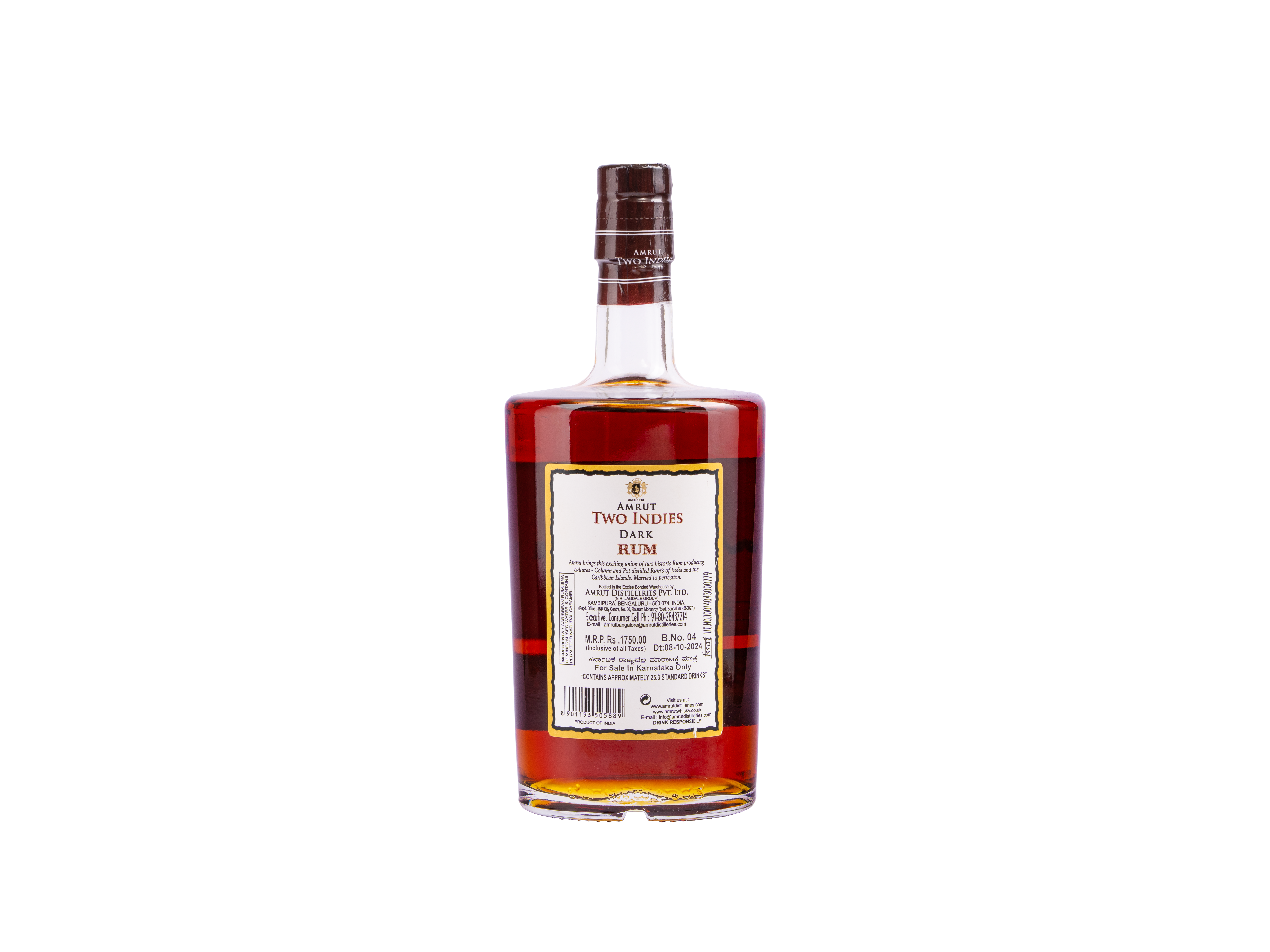 Produced by the esteemed Amrut Distilleries, this dark rum is a testament to the artistry of blending. It intertwines two distinctive rum varieties to create a symphony of flavors. The first rum, crafted from Jaggery in the Indian state of Karnataka, undergoes pot still distillation and matures in American oak barrels, infusing it with rich nuances. The second, a Jamaican rum renowned for its intense character and robust aromas, adds depth to the blend. Meticulously harmonized, these rums undergo a meticulous blending process before bottling in India, ensuring that each sip offers a captivating journey through the finest traditions of rum-making.